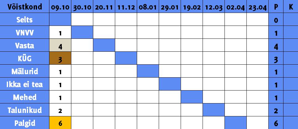 Esimese võistluse pingerida kujunes küllalt pinevaks, saades lõpplahenduse alles viimases voorus. Pingelise mängu esikoha võitis sel korral kahepunktilise eduga võistkond Palgid konkurentide Vasta ja KÜG ees. Viimaseid eraldas omakorda vaid punkt.